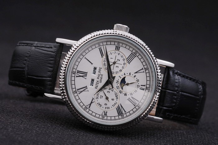 Die Uhr wird von einem kinetischen (automatischen) Japanischen Miyota Uhrwerk angetrieben, das für seine Zuverlässigkeit und Präzision bekannt ist. Das elegante schwarze Zifferblatt, kombiniert mit der polierten Edelstahl-Lünette und dem schwarzen Lederarmband, verleiht der Uhr eine zeitlose Eleganz. Das Armband ist außerdem mit einem Patek Philippe Stempel versehen, was der Uhr eine zusätzliche Note von Luxus verleiht. Der Flip Clasp sorgt für einen sicheren Halt am Handgelenk und macht das Tragen dieser Patek Philippe Replica Watch äußerst bequem.