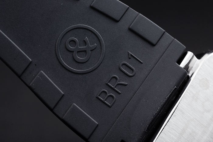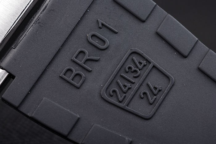 Armband: Schwarzes Kautschukband mit Wärme geprägtes Logo, Modellnummer und Produktcode und BR graviert gebürstetem Edelstahl Haken-Schließe