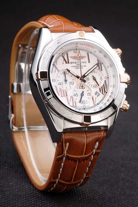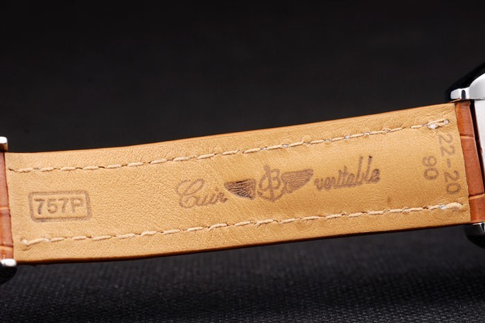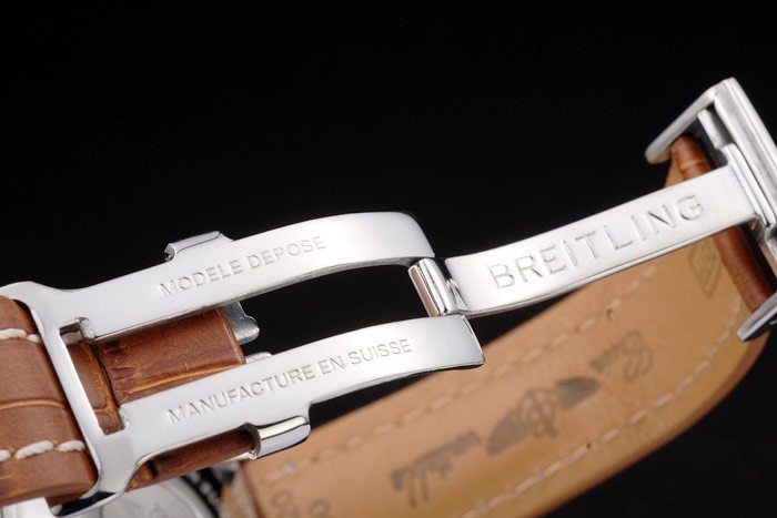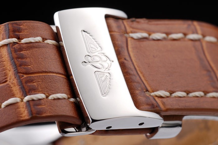 Armband: Brown Krokolederarmband mit Patent weißen Nähten und Wärme geprägt Breitling Gravuren und gravierten Edelstahl falten Gelbgold Indexmarken und graviert Minute markings