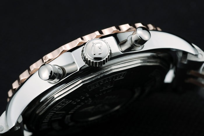 Krone: Edelstahl poliert cutwork Krone mit Breitling-logo und zwei kleinere Edelstahl Push -Schaltfläche Kronen auf beiden Seiten des it