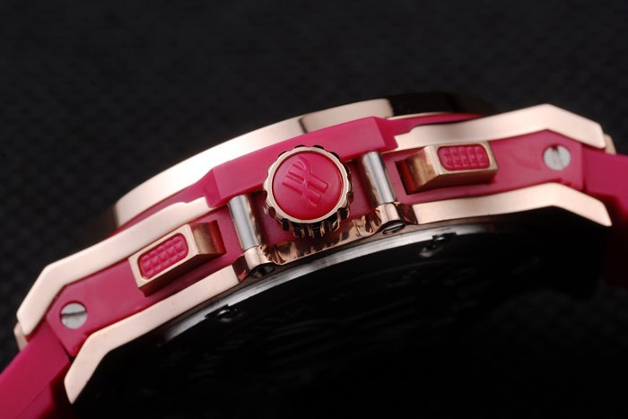 Krone: Cutwork rose-goldene Krone mit ‚H‘ Gravur und zwei rechteckige Druckknopf-Kronen auf beiden Seiten, die alle besetzt mit rosa Gummi trimmings