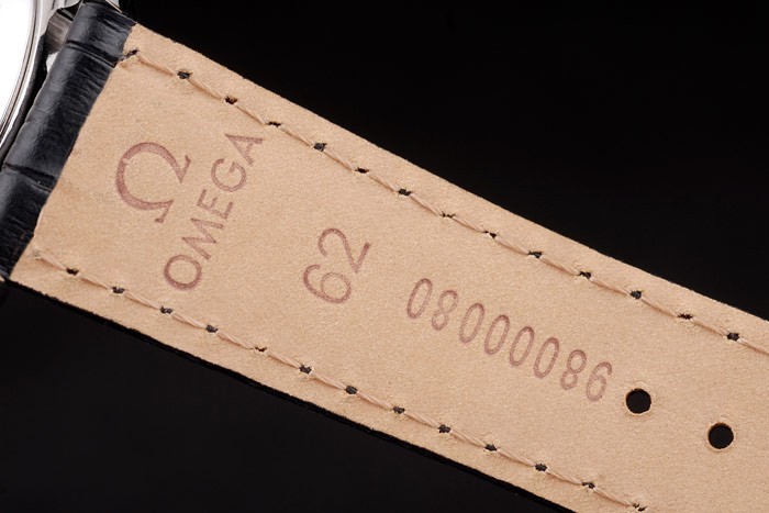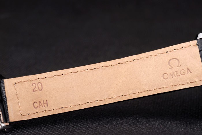 Armband: Schwarz Krokodillederband mit Hitze geprägt Omega Stempel und Edelstahl Einfalt-Verschluss mit Omega-logo auf top