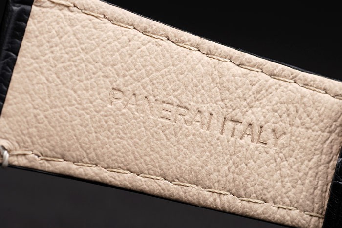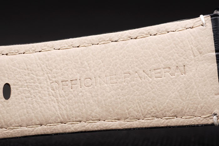 Armband: Schwarz Krokodillederband mit weißen Nähten und Wärme geprägt Officine Panerai Italien Stempel und ionenplattiert Haken-Schließe mit Panerai engraving