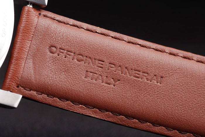 Armband: Braunes Lederarmband mit weißen Nähten und Wärme geprägt Officine Panerai Italien Stempel und gebürstetem Edelstahl Haken-Schließe mit Panerai engraving