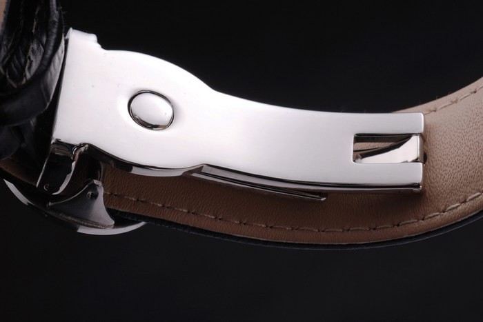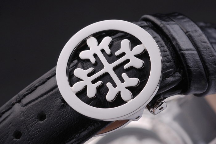 Armband: Schwarzes Lederband mit Patek Philippe Stempel und einem Edelstahl-Falte in Spange mit Patek logo Schnalle