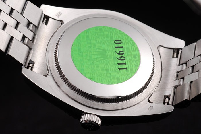Rückseite: Edelstahl Push-Gehäuseboden mit grünen Rolex-Logo stamp