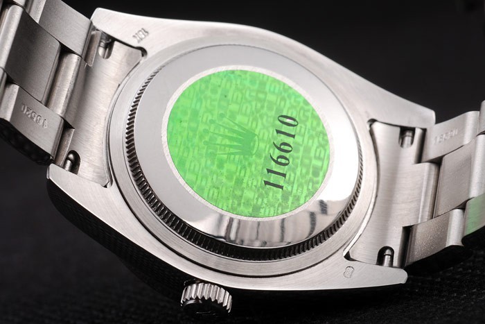 Rückseite: Edelstahl Push-Gehäuseboden mit grünen Rolex-Logo stamp