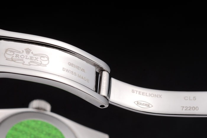 Rückseite: Edelstahl Push-Gehäuseboden mit grünen Rolex-Logo stamp