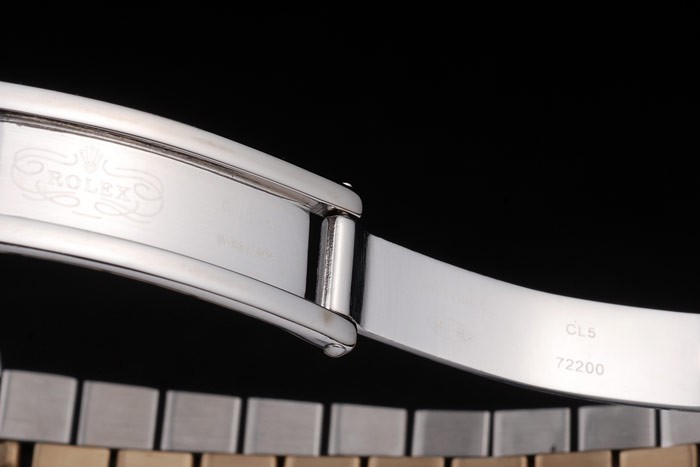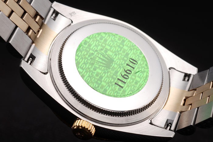 Rückseite: Edelstahl Push-Gehäuseboden mit grünen Rolex-Logo stamp
