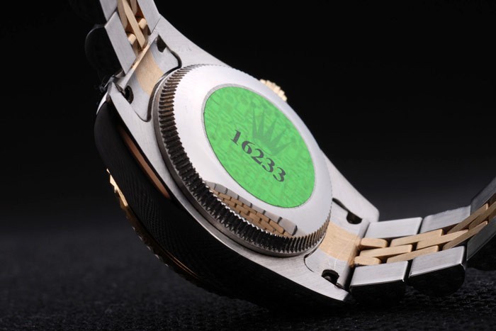 Rückseite: Edelstahl Push-Gehäuseboden mit grünen Rolex-Logo stamp