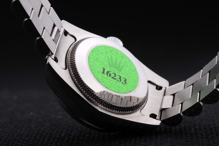 Rückseite: Edelstahl Push-Gehäuseboden mit grünen Rolex-Logo stamp