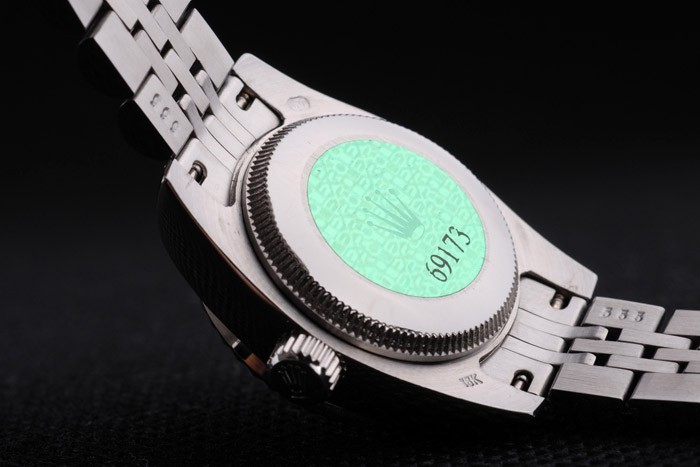 Rückseite: Edelstahl Push-Gehäuseboden mit grünen Rolex-Logo stamp