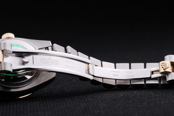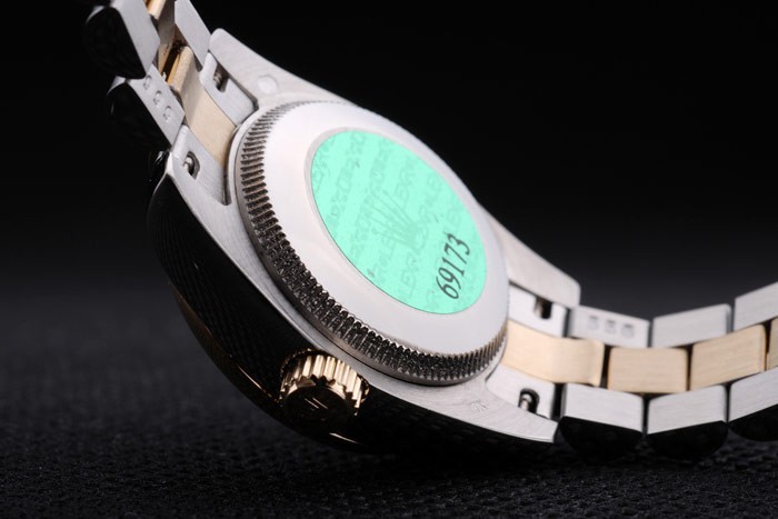 Rückseite: Edelstahl Push-Gehäuseboden mit grünen Rolex-Logo stamp
