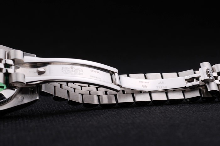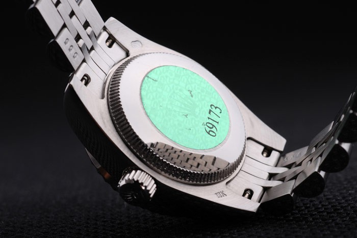 Rückseite: Edelstahl Push-Gehäuseboden mit grünen Rolex-Logo stamp