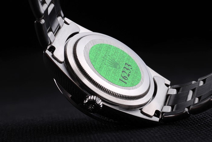 Rückseite: Edelstahl Push-Gehäuseboden mit grünen Rolex-Logo stamp
