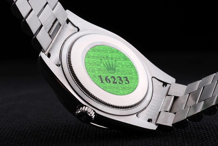 Rückseite: Edelstahl Push-Gehäuseboden mit grünen Rolex-Logo stamp