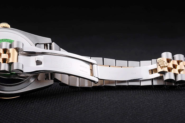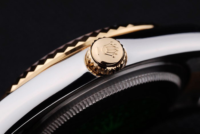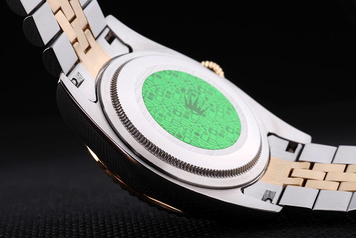 Rückseite: Edelstahl Push-Gehäuseboden mit grünen Rolex-Logo stamp