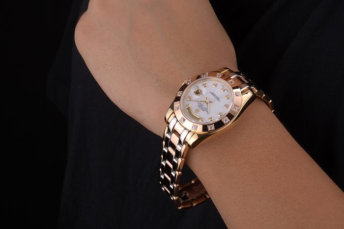Armband plattiert: Poliert und Goldton Edelstahl-Gliederarmband mit Rolex Gravur versteckt Spange Anzeige Rolex logo