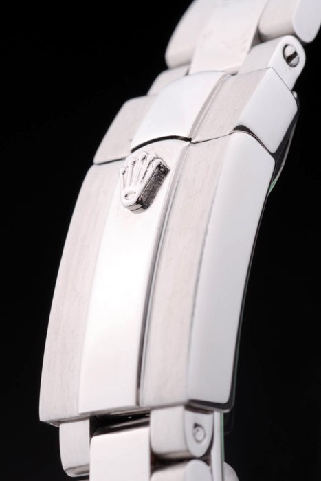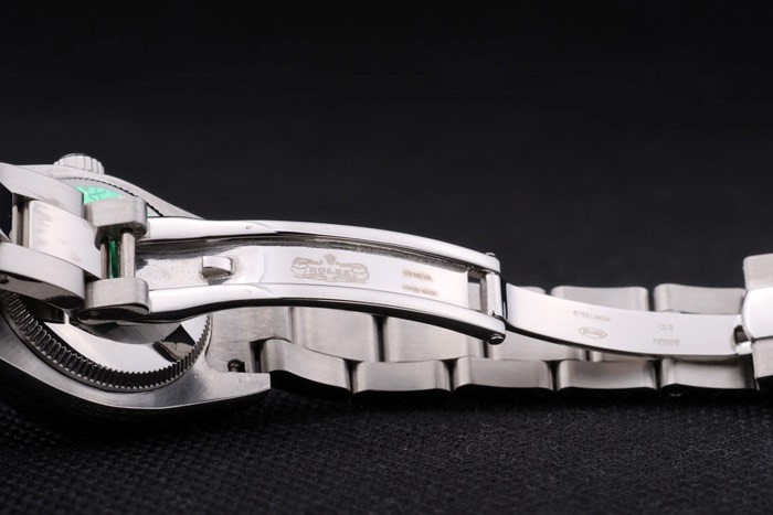 Rückseite: Edelstahl Push-Gehäuseboden mit grünen Rolex Gravur stamp