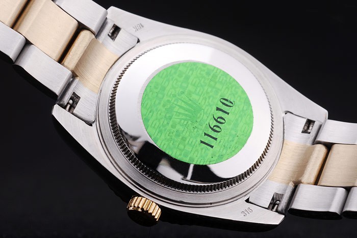 Rückseite: Edelstahl-Snap-In Rückseite mit grünen Rolex Authentizität sticker
