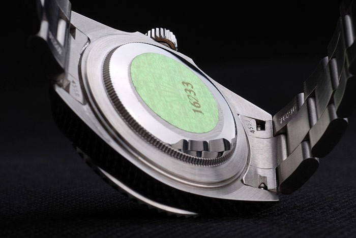 Rückseite: Edelstahl Push-Gehäuseboden mit grünen Rolex Gravur stamp