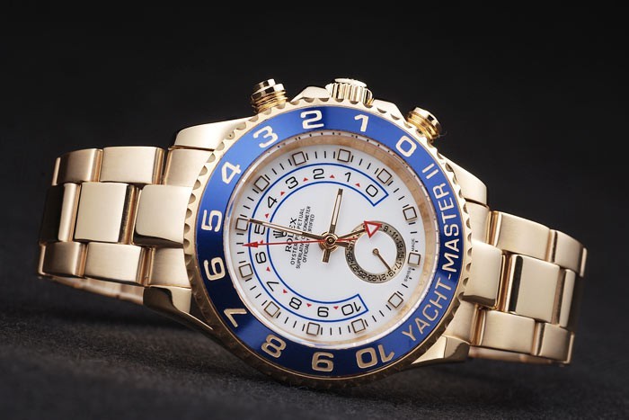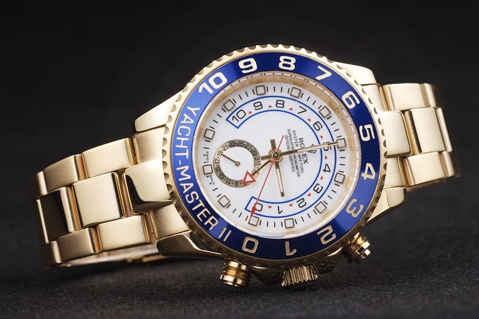 Lünette: Gelbgold mit 1 bis 10 Markierungen und Yacht Master Gravur auf einem blauen Lack background