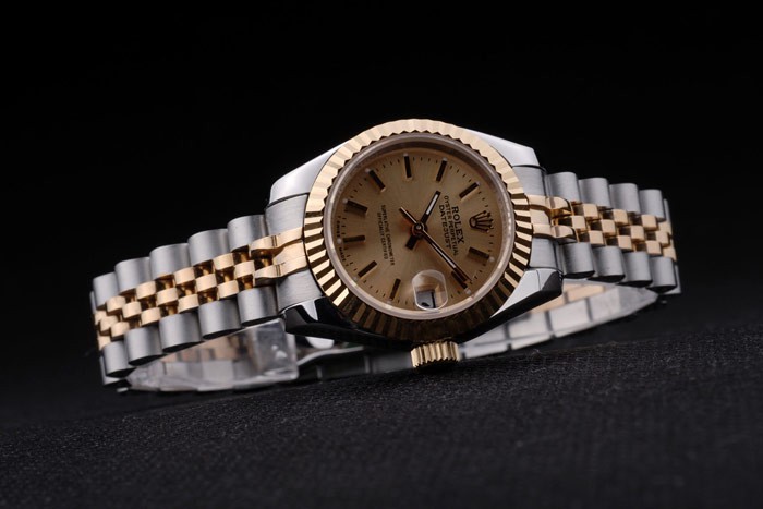 Angetrieben wird die Replica von einem kinetischen (automatischen) Uhrwerk der renommierten japanischen Marke Miyota, das präzise und zuverlässig arbeitet. Das Armband besteht aus zwei getönten Gliedern aus poliertem Edelstahl und ist mit 18 Karat Gelbgold überzogenem Stahl veredelt. Die unsichtbare Schließe mit Rolex-Gravur und das versteckte Rolex-Logo setzen exklusive Akzente und sorgen für höchsten Tragekomfort mit einer Länge von 190 x 13 mm. Hochwertiges Saphirkristallglas schützt das Zifferblatt, während die 18K Gelbgold überzogene Edelstahl-Krone mit feiner Cutwork-Verzierung das Gesamtbild harmonisch abrundet – typisch für die zeitlose Schönheit der „rolex lady datejust“.
